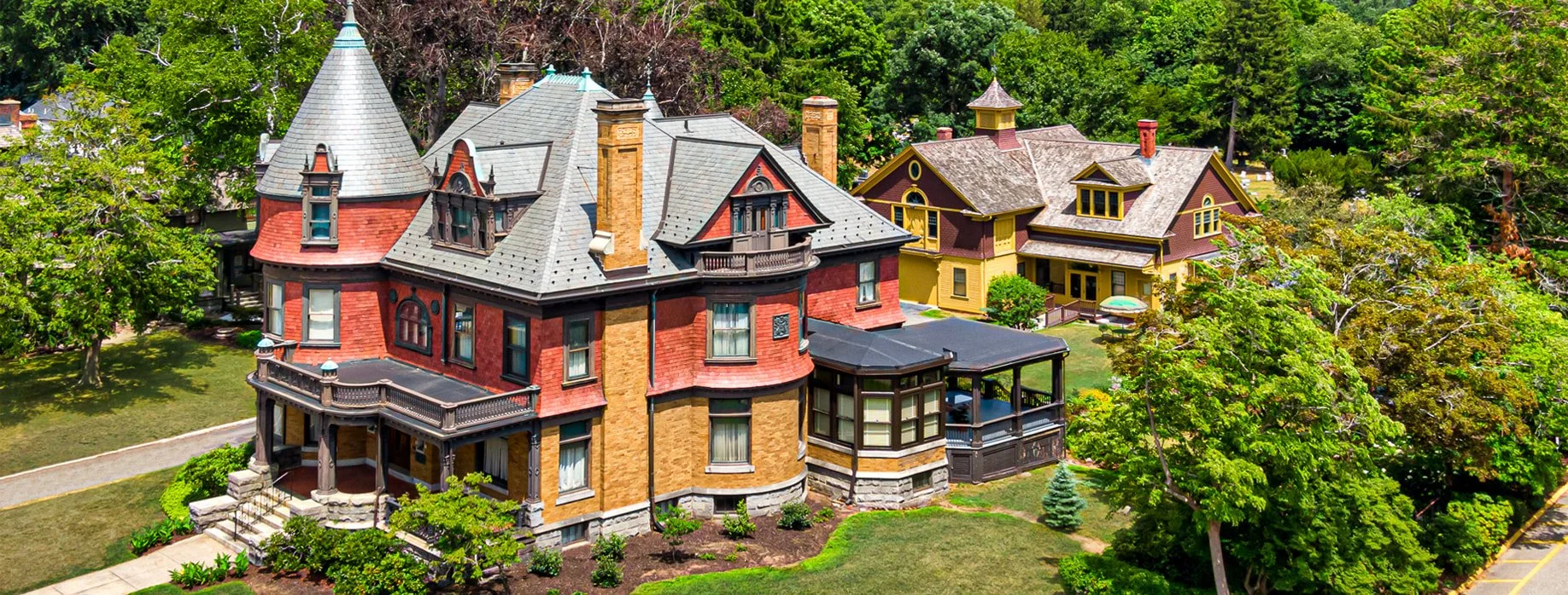 Hotchkiss-Flyer House Museum with Torrington History Museum at left and carriage house visible behind, all located in downtown Torrington, CT.